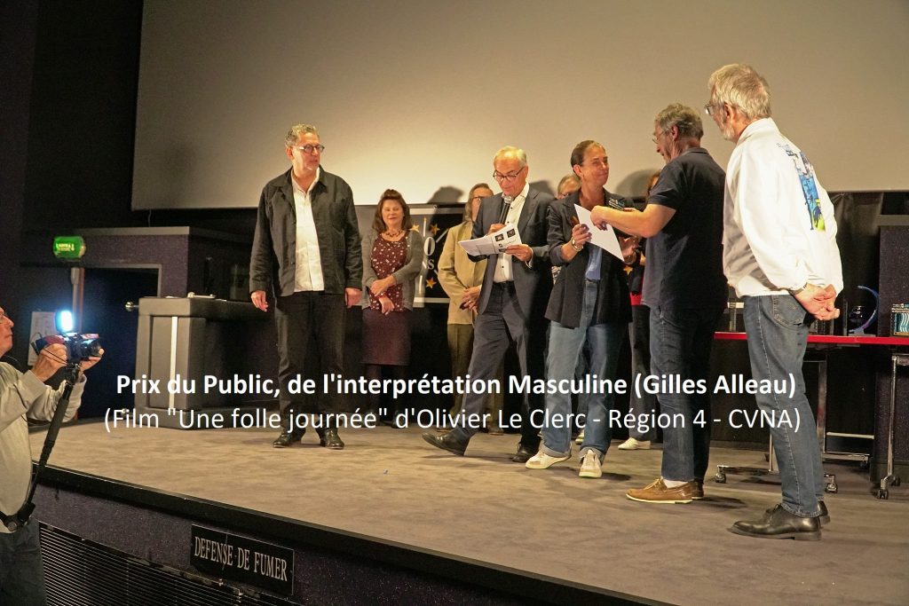 Je participe le dimanche, presque par politesse, à la cérémonie de remise des prix attribués par le jury : vu la qualité des participations, il n’y a pas beaucoup d’illusion à se faire. Pour « Une Folle Journée », Didier a dit : le prix de l’humour. Ce serait sympa, effectivement. Mais quand le prix de l’humour a été attribué à un autre film (La Crèche), il ne restait plus qu’à patienter avant l’apéritif de fin de festival. D’où la surprise à l’annonce du Prix de l’interprétation masculine pour « Une Folle Journée » : ah, ça fait plaisir pour Gilles Alleau, notre acteur fétiche, car il y avait du beau monde sur la liste des prétendants ! Et cela confirme son talent car c’est ça troisième récompense pour son interprétation dans ce film.